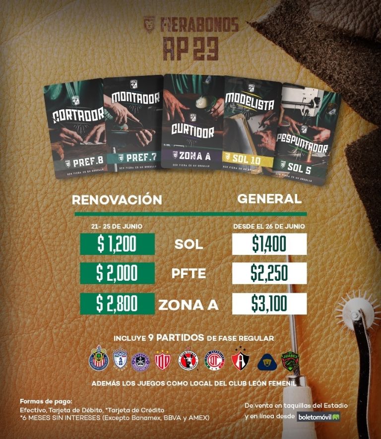 Costos por adquisición: Sol – $1,400 pesos. Preferente – $2,250 pesos. Zona A – $3,100 pesos.