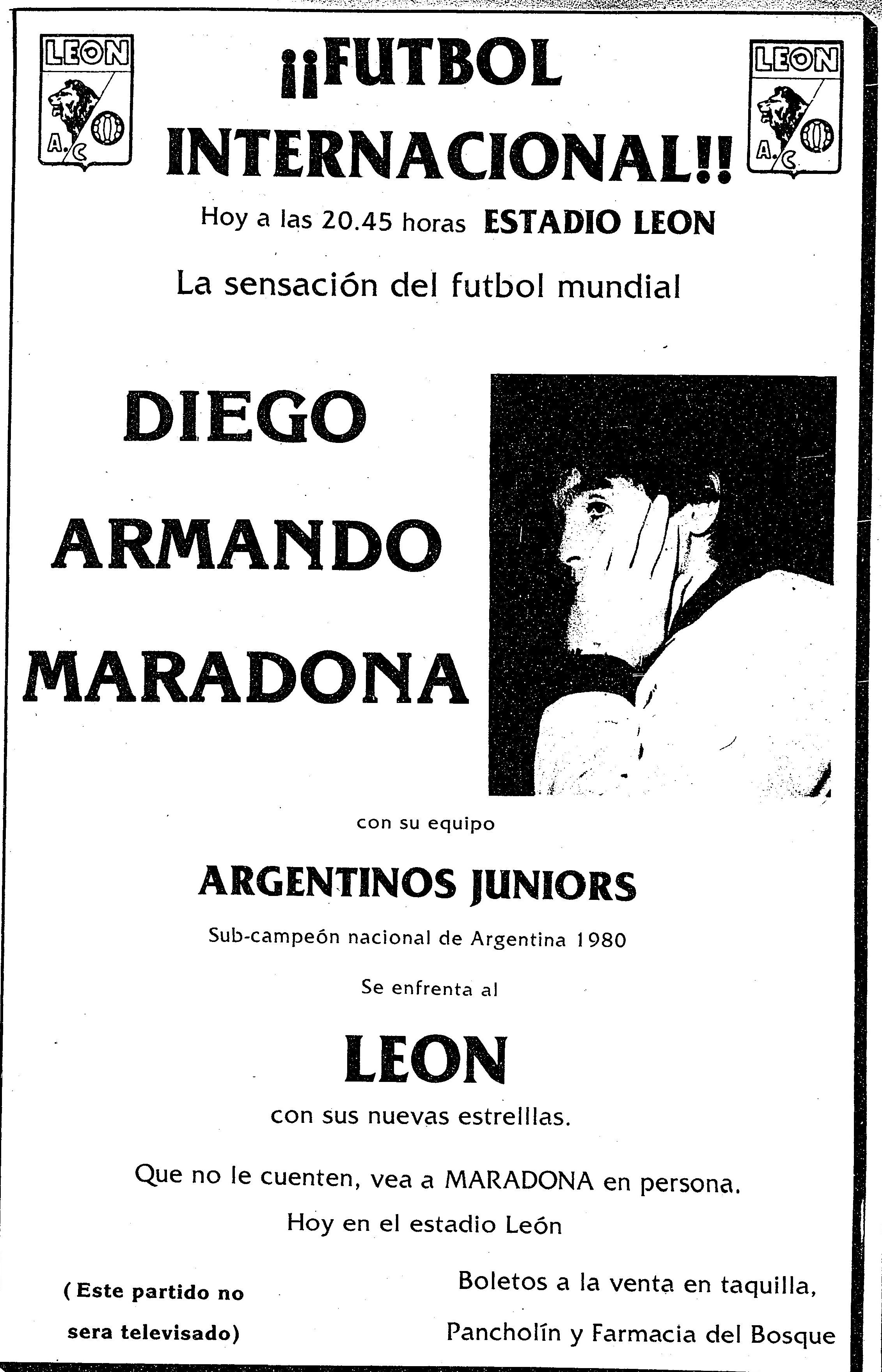 “La sensación del futbol mundial, Maradona, con su equipo Argentinos Juniors, subcampeón nacional de Argentina en 1980, se enfrenta al León con sus nuevas estrellas“, se lee al centro de la publicidad que avisa a los lectores entre paréntesis que “este partido no será televisado”, seguido de “boletos a la venta en taquilla, Pancholín y Farmacia del Bosque”.
