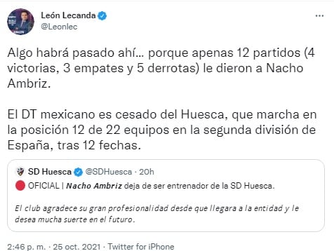 La irregularidad que mostró el Huesca de Ignacio Ambriz en las primeras 12 jornadas de la temporada 2021-2022 fue uno de los factores que determinaron el cese del extimonel del Club León en el cuadro de Aragón, no obstante, existiría uno más que habría motivado a los directivos, o a Ambriz, a cortar la relación laboral.