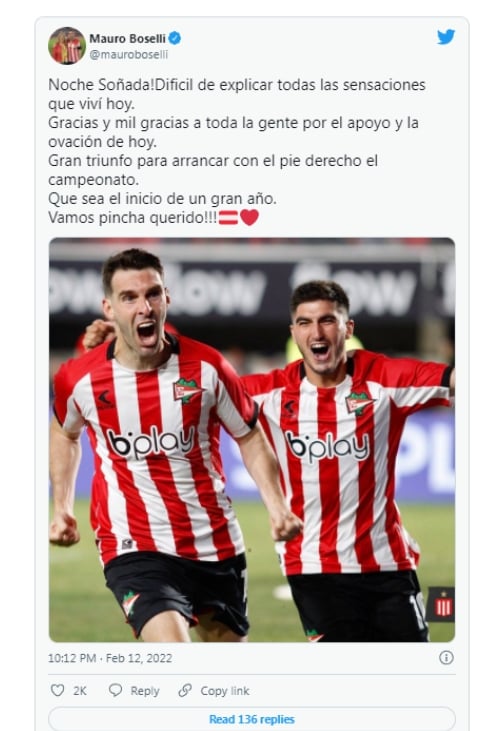 Noche soñada. Difícil de explicar todas las sensaciones que viví hoy. Gracias y mil gracias a toda la gente por el apoyo y la ovación de hoy”, escribió Boselli en Twitter, señalando que obtuvieron un gran triunfo para iniciar la temporada.