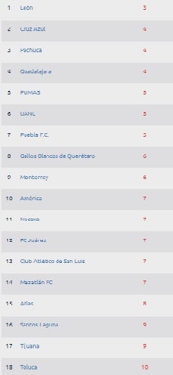Previo a los juegos que están por disputarse este fin de semana, los esmeraldas son el primer equipo de la tabla de defensivas en el torneo, mientras que en segundo lugar se encuentra Cruz Azul con cuatro dianas, mismo que Pachuca y Chivas.