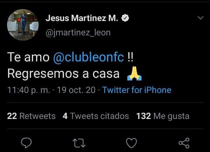 “Te amo, Club León. Regresemos a casa”, publicó Martínez, con algunos emojis.
