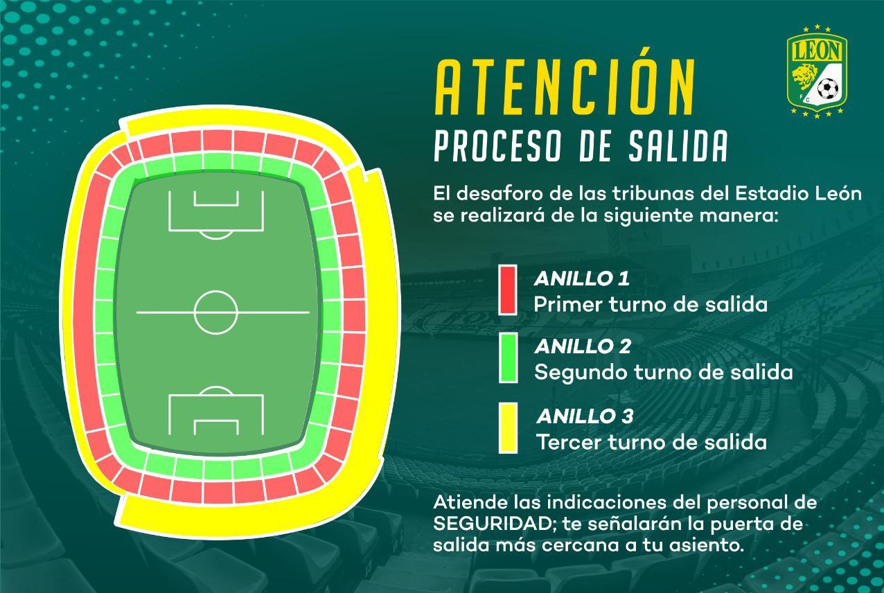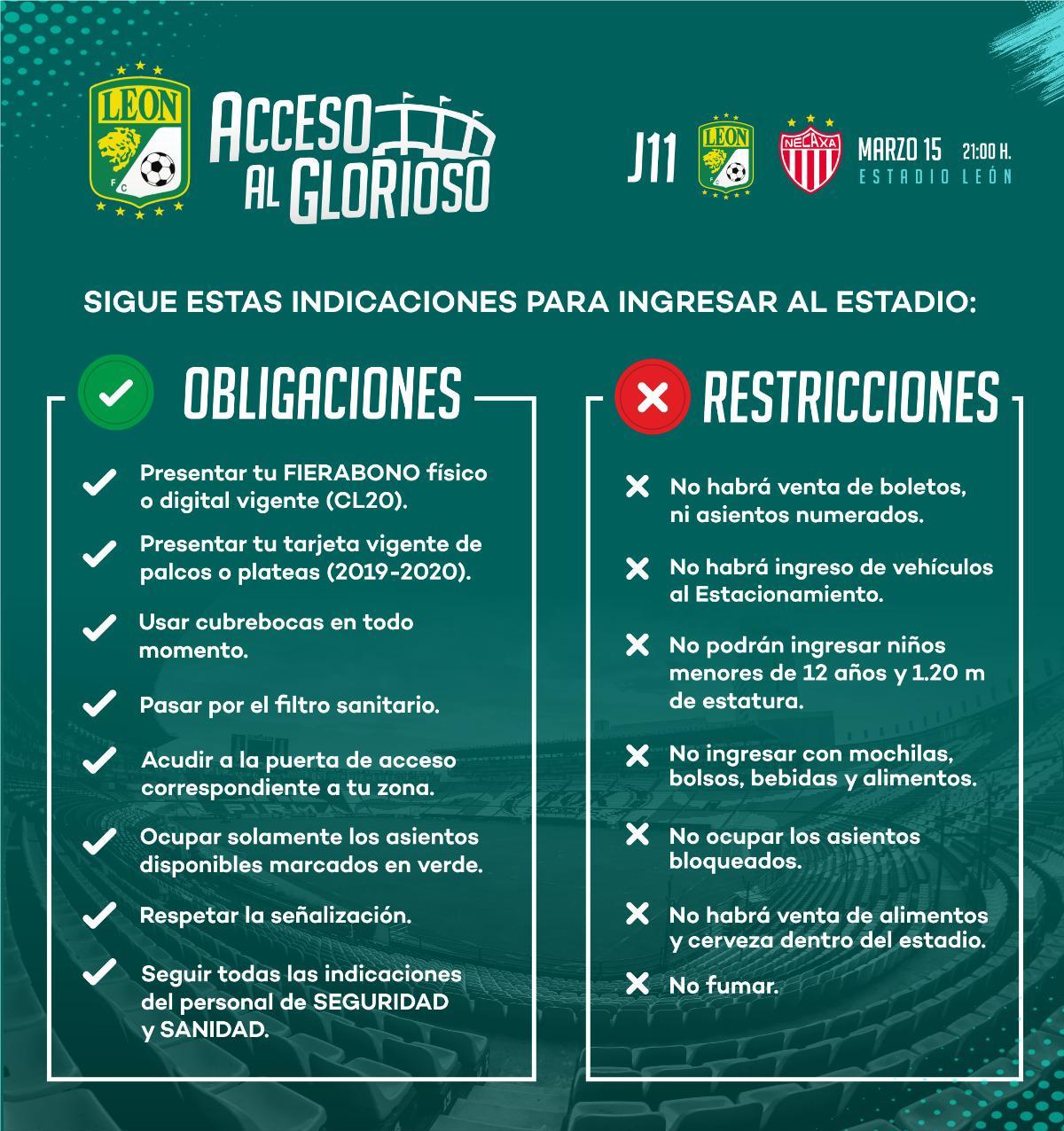 En el comunicado, el Club León anunció que las puertas señaladas para permitir el ingreso de la afición se abrirán a partir de las 18:00 horas (tres horas antes del partido), y no se permitirá el ingreso de niños menores de 12 años.