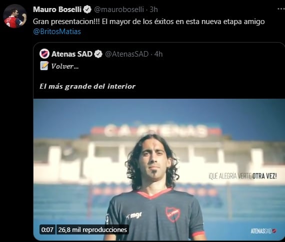 “Gran presentacion!!! El mayor de los éxitos en esta nueva etapa amigo @BritosMatias”, le escribió Boselli en Twitter.