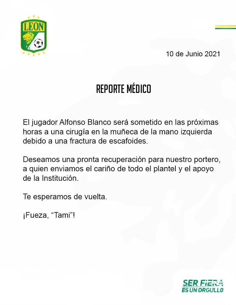 Mediante un comunicado publicado en redes sociales, el cuerpo médico esmeralda confirmó que Blanco será intervenido quirúrgicamente de la muñeca de su mano izquierda debido a una fractura de escafoides.