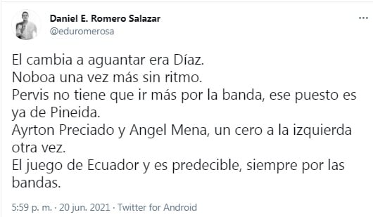 A diferencia del primer partido ante Colombia, Ángel Mena saltó a la cancha brasileña como parte de la oncena titular. Gustavo Alfaro lo ubicó por la banda derecha pero el desempeño del esmeralda no fue brillante.