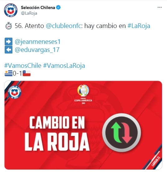 Uruguay consiguió el gol del empate minutos después de este cambio, y aunque Chile tuvo contadas opciones de anotar en el segundo tiempo, una de ellas corrió por cuenta de Meneses en el minuto 77″.