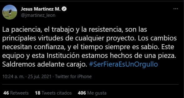 Tras la escandalosa derrota sufrida en la cancha del estadio Hidalgo a manos de los Tuzos del Pachuca en la Jornada 1 del nuevo torneo Apertura 2021 de la Liga MX, Jesús Martínez Murguía, presidente del Club León proyectó su opinión a través de sus redes sociales.