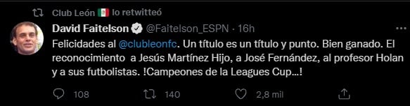 - Felicidades al @clubleonfc . Un título es un título y punto. Bien ganado. El reconocimiento a Jesús Martínez Hijo, a José Fernández, al profesor Holan y a sus futbolistas. !Campeones de la Leagues Cup&!