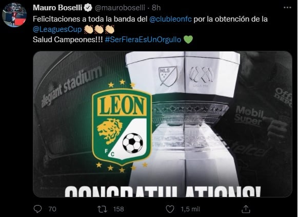 El más reciente título del Club León en Leagues Cup, hizo que los ojos del mundo voltearan a ver a la institución verdiblanca por lo que figuras como Mauro Boselli o hasta el periodista David Faitelson de la cadena ESPN decidieron felicitar a la Fiera.