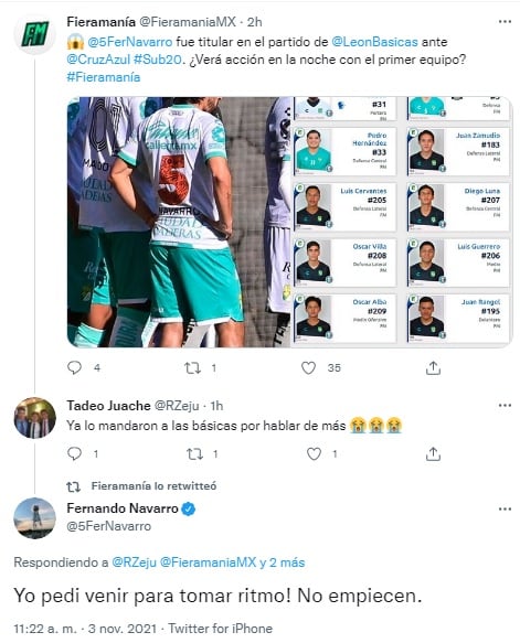En una publicación realizada en la cuenta de Fieramanía, donde se destacaba la presencia de Navarro en la alineación inicial de la Sub-20, un usuario señaló que el motivo de esta determinación se debía quizá a su disgusto por no haber tenido minutos ante Toluca.