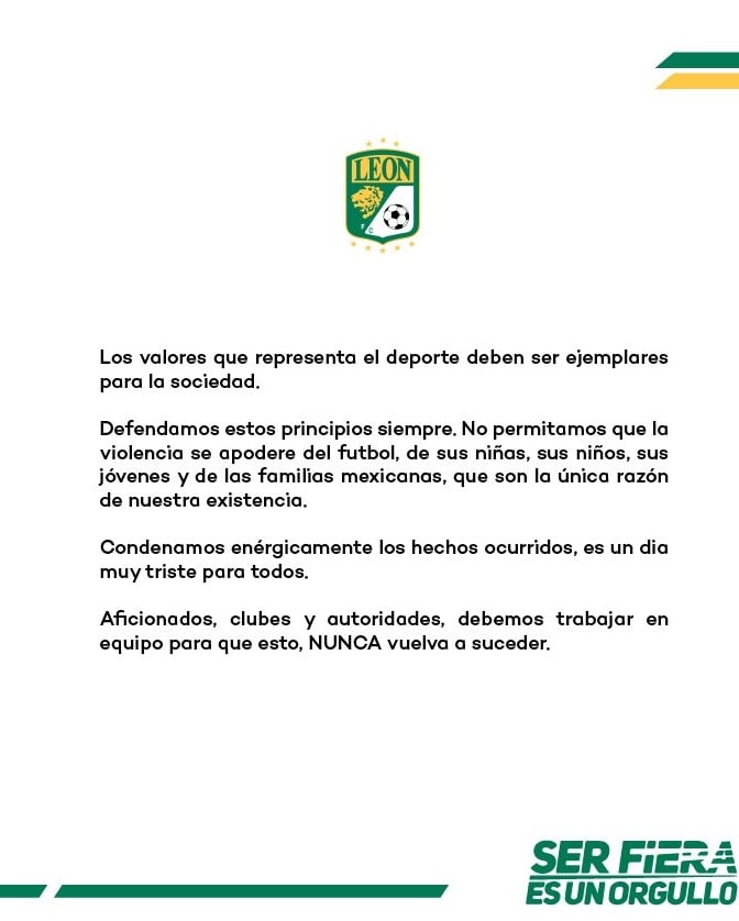 Así como la gran mayoría de los equipos que forman parte de la Liga MX, el Club León condenó los lamentables actos de violencia que tuvieron lugar el sábado durante el partido que protagonizaron Querétaro y Atlas en La Corregidora.