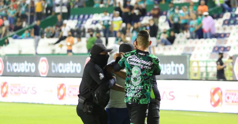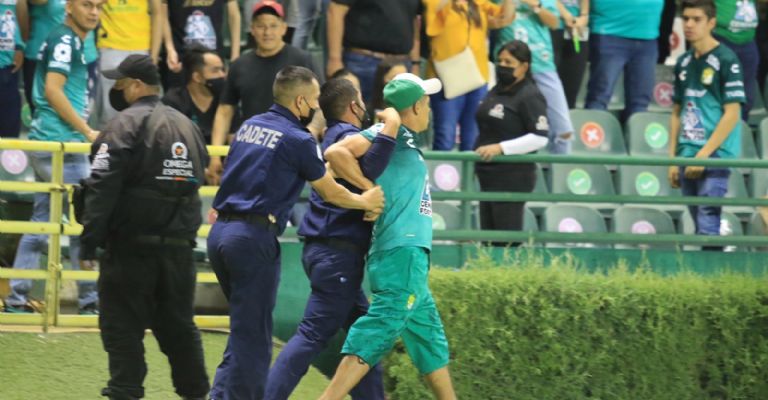 Varios policías municipales corrieron desde un costado de la cancha y taclearon a los fanáticos, quienes se dirigían hacia los jugadores del León que se despedían de la gente.