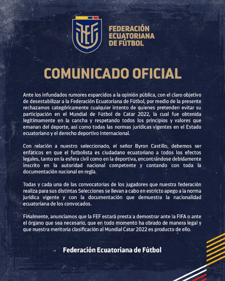 Debemos ser enfáticos en que el futbolista es ciudadano ecuatoriano a todos los efectos legales, tanto en la esfera civil como en la deportiva, encontrándose debidamente inscrito”.