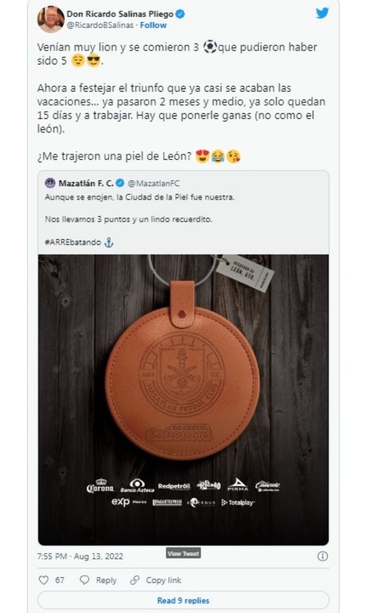 Mediante su cuenta de Twitter, Mazatlán aseguró que “la Ciudad de la Piel” fue de ellos, ya que ganaron los tres puntos y también se llevaron de León “un lindo recuerdito”, mostrando el llavero de piel.