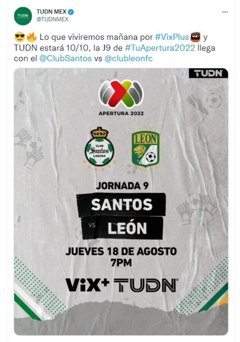 Mediante sus redes sociales, TUDN informó que este jueves 18 de agosto se verá el partido entre León y Santos, que iniciará a las 7:00 de la noche.