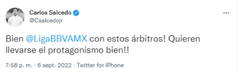 En Twitter, Carlos Salcedo mencionó a la Liga Mx, ironizando que los árbitros “están bien”.