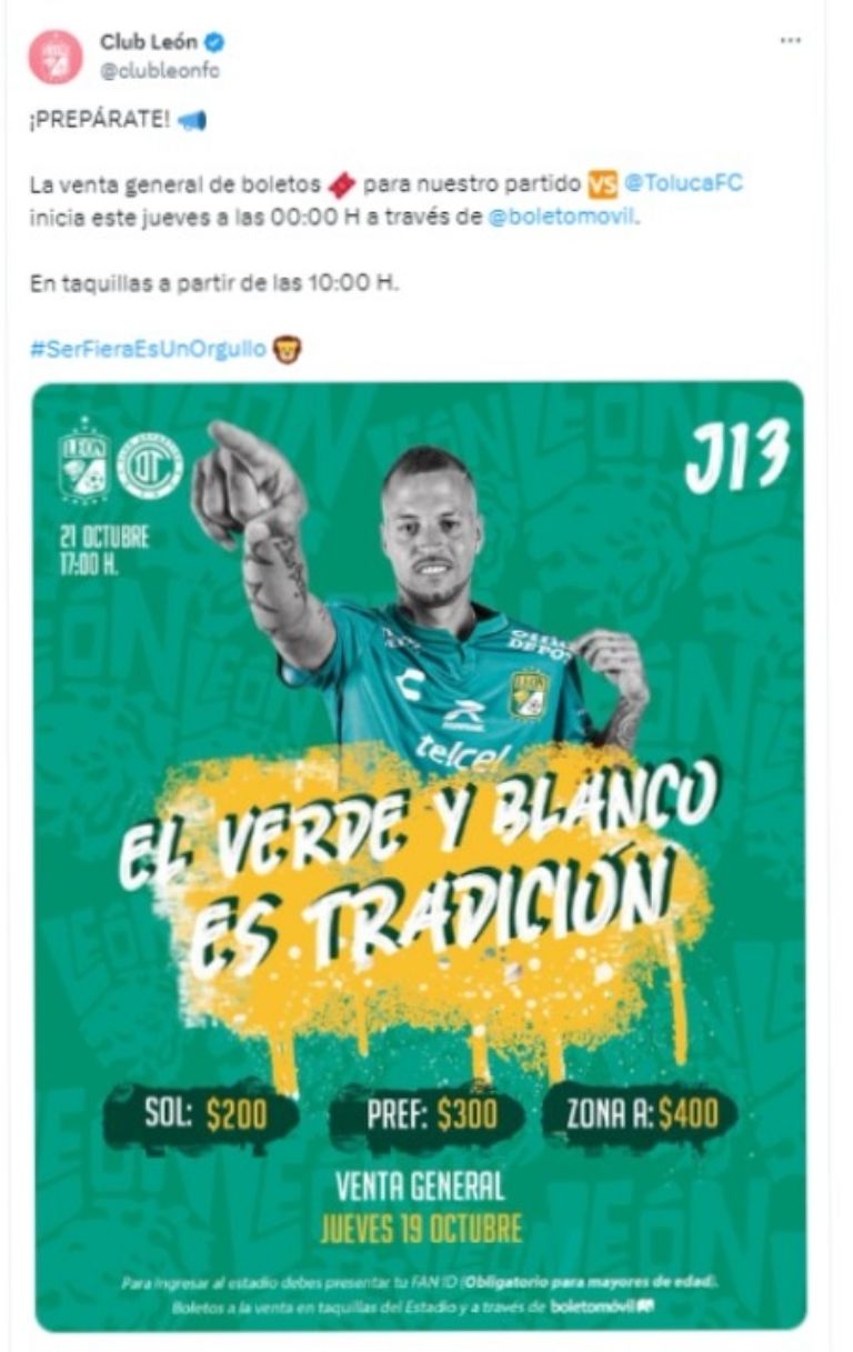 Mediante sus redes sociales, León dio a conocer que a partir de la medianoche del 19 de octubre, aficionados podrán comprar boletos para el partido ante Toluca mediante la página de Boletomóvil.