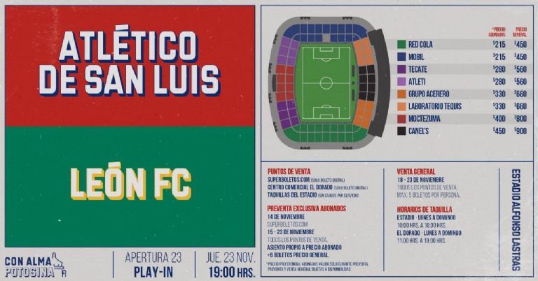 Recordar que para este duelo entre Atlético de San Luis y León correspondiente al Play-In, los costos de los mismos iban desde los 300 a los 900 pesos aproximadamente, por lo que la venta ha avanzado de manera más lenta de lo esperado.