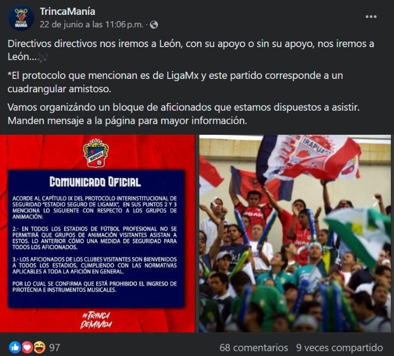 En Irapuato es el perfil de Facebook, denominado: “Trincamanía”, donde se publicó el siguiente mensaje: “Directivos directivos nos iremos a León, con su apoyo o sin su apoyo, nos iremos a León. El protocolo que mencionan es de LigaMx y este partido corresponde a un cuadrangular amistoso. Vamos organizando un bloque de aficionados que estamos dispuestos a asistir. Manden mensaje a la página para mayor información.