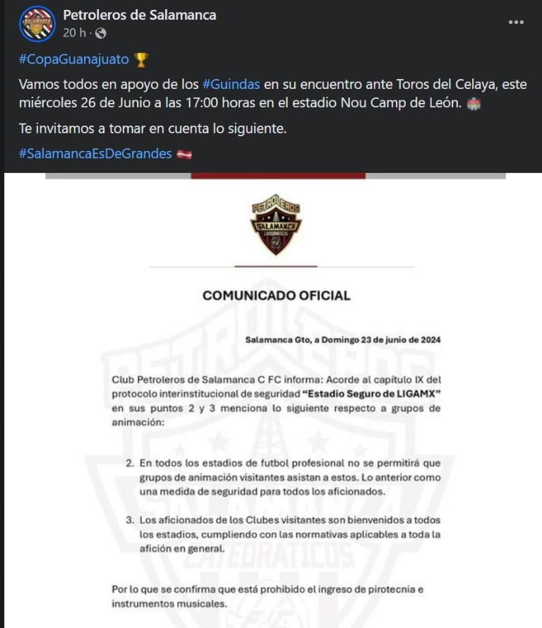Finalmente el perfil “Petroleros de Salamanca”, publicó: “Vamos todos en apoyo de los #Guindas en su encuentro ante Toros del Celaya, este miércoles 26 de junio a las 17:00 horas en el estadio Nou Camp de León”, mismo que acompañó de un comunicado oficial emitido por el club en el que se explica la prohibición en el ingreso al estadio de artefactos de pirotecnia.