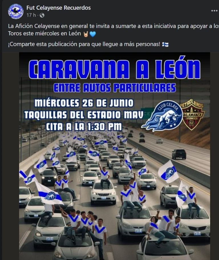 Por su parte el también perfil de Facebook, “Fut Celayense Recuerdo”: lanzó el siguiente mensaje: “La Afición Celayense en general te invita a sumarte a esta iniciativa para apoyar a los Toros este miércoles en León ¡Comparte esta publicación para que llegue a más personas!”